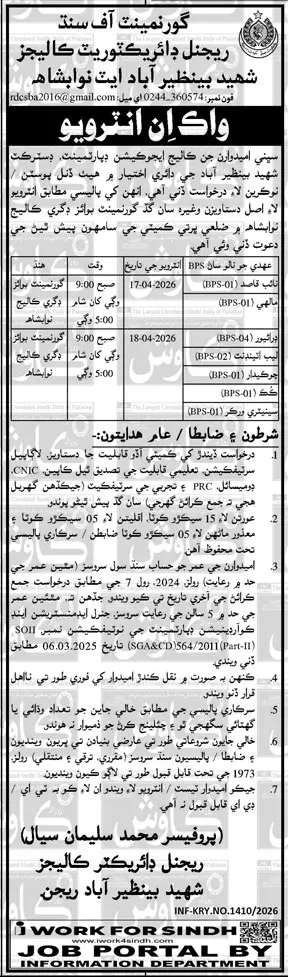 The Regional Directorate Colleges of the Shaheed Benazirabad Region has declared multiple Naib Qasid job openings in Nawabshah for qualified individuals. This recruitment initiative seeks to occupy several Class IV roles at the Government Boys Degree College in Nawabshah, under the auspices of the Government of Sindh.